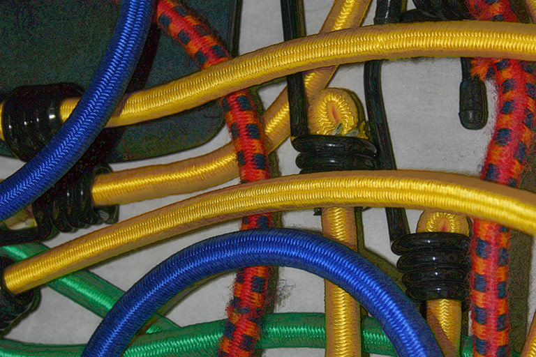 Another one from my travels 'round the office. The student employees in my department at work are often found hauling gear around - we recently got a new utility cart and these brightly colored bungee cords. The arrangement and color of these tie-downs told me to trip the shutter a few times, so I did. This was tweaked a bit to emphasize the textures and give somewhat of an illustrated feel.